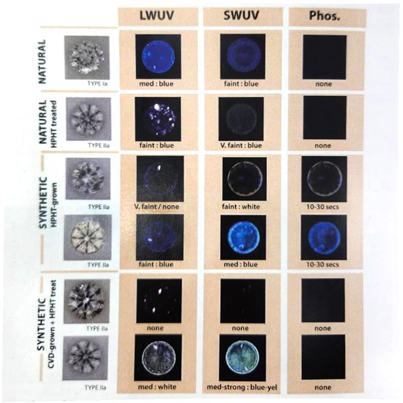 แต่ในปัจจุบันเพชรแท้ CVD รุ่นใหม่พบว่ามีข้อสังเกตุที่แตกต่างกันคือ เพชรจะแสดงปฏิกริยาต่อหลอด Ultraviolet คลื่นสั้น เป็นสีขาว และ คลื่นยาว เป็นสีเหลืองแกมน้ำเงิน แต่ยังคงมีปฏิกริยาต่อคลื่นสั้นเข้มข้นกว่าคลื่นยาวอยู่เช่นเดิม ถึงกระนั้นก็พบว่าบางเม็ดไม่มีปฏิกริยาใดๆต่อคลื่นเลย ดังนั้นเม็ดที่ไม่มีปฏิกริยาต่อคลื่นจึงไม่ควรสรุปด้วยวิธีนี้