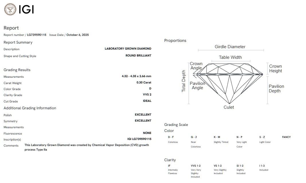 เพชรแท้ Lab Grown Diamond 0.30 กะรัต น้ำ GREEN เกรด VS1 VG VG VG N พร้อมเซอร์ IGI (1CER601)