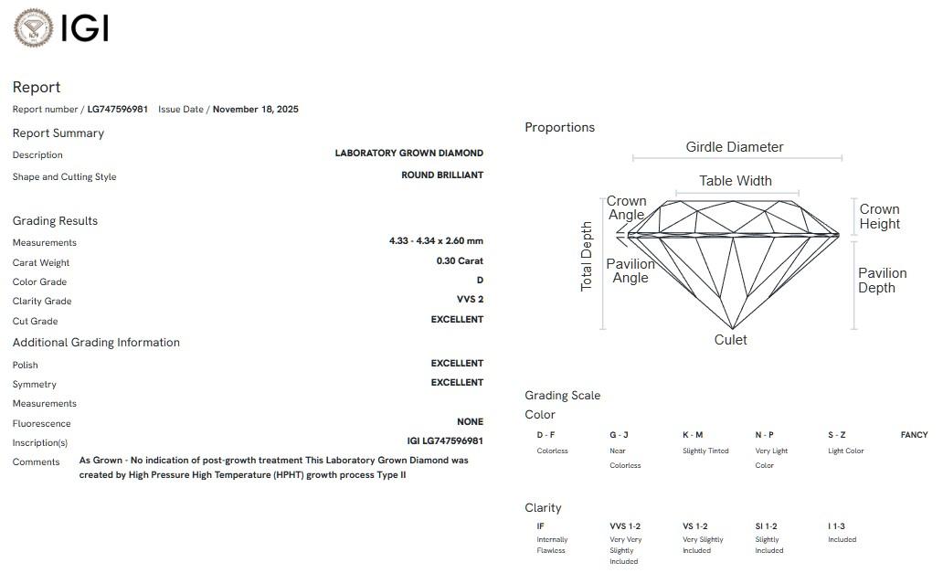 เพชรแท้ Lab Grown Diamond 0.31 กะรัต น้ำ 98 เกรด VS1 EX EX EX N พร้อมเซอร์ IGI (1CER352)