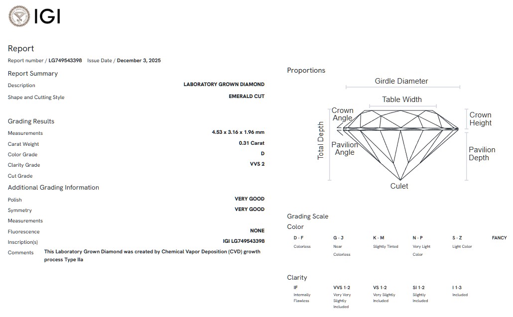 เพชรแท้ Lab Grown Diamond 0.31 กะรัต น้ำ 98 เกรด VS2 H&A EX EX N พร้อมเซอร์ IGI (1CER267)