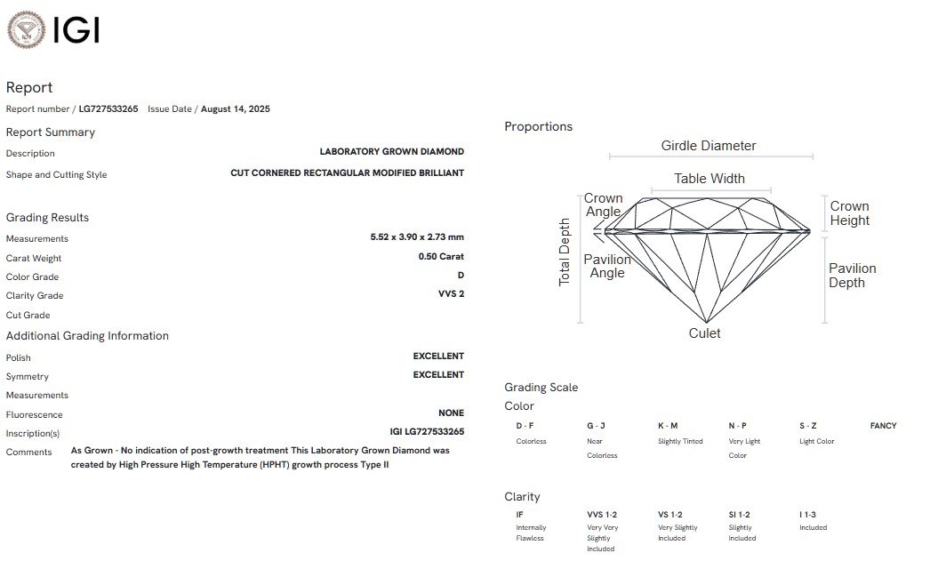 เพชรแท้ Lab Grown Diamond 0.51 กะรัต น้ำ GREEN เกรด VS2 VG VG VG N พร้อมเซอร์ IGI (1CER616)