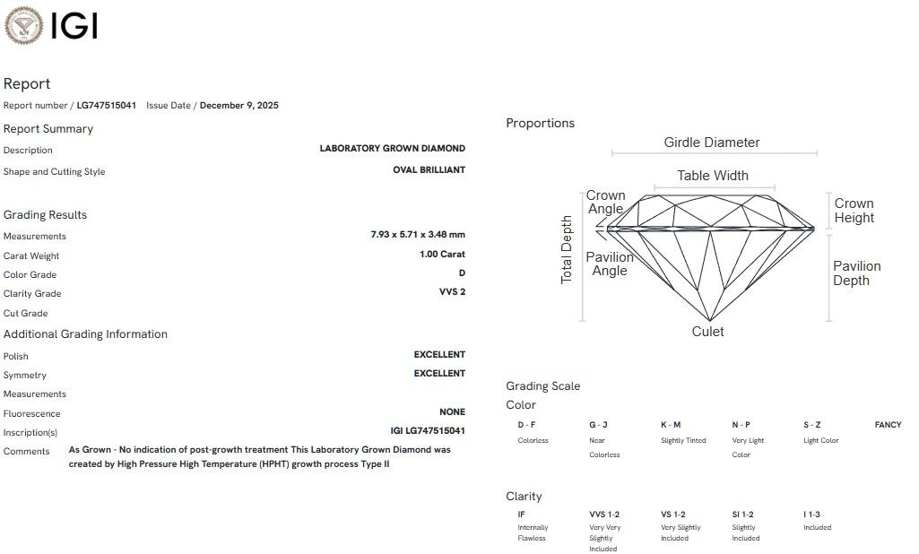 เพชรแท้ Lab Grown Diamond 1.00 กะรัต น้ำ 100 เกรด VVS2 EX EX N พร้อมเซอร์ IGI (1CER2049)