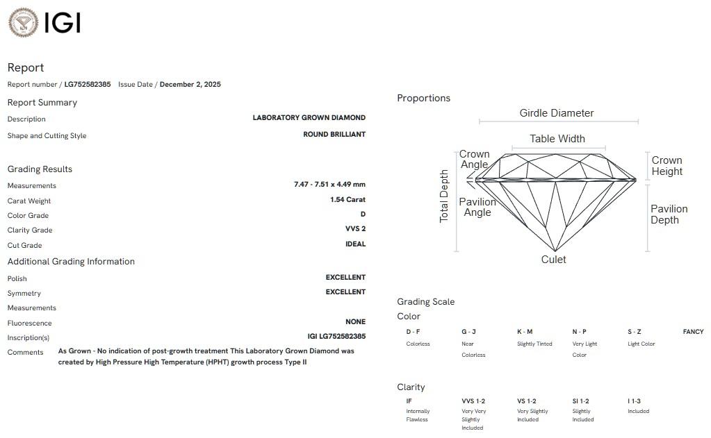 เพชรแท้ Lab Grown Diamond 1.54 กะรัต น้ำ 100 เกรด VVS2 ID EX EX N พร้อมเซอร์ IGI (1CER2057)