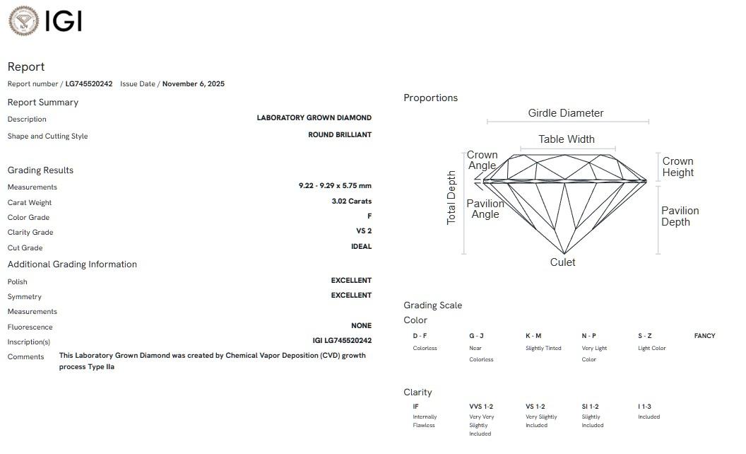 เพชรแท้ Lab Grown Diamond 3.02 กะรัต น้ำ 98 เกรด VS2 ID EX EX N พร้อมเซอร์ IGI (1CER2054)